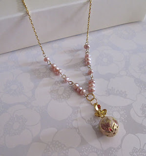 Ericia, pretty in name. Made with lovely freshwater pearls in peach tone with a tensha drop pendant at the centre.