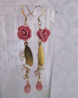 Faith - A pretty and rosy earrings. Made with lovely clay roses with clusters of fire polished czech beads, pastel sweet glass beads, cherry quartz drops and an oval brass charms with wordings "family".