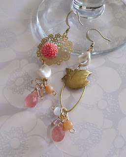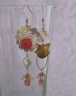 Joel - Assymmetrcal earrings from Nature. It is made with rosy pink floral cabochons on matte gold floral piece and vintage like brass dove charm from overseas, with clusters of precious stones of cherry quartz drops, brazilian Agate beads.