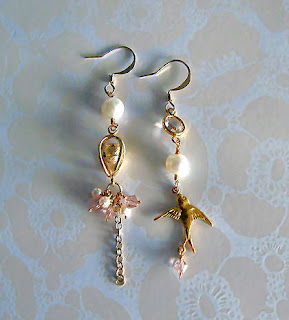 Bliss Flight - whimsical and lovely. Made with lovely Swarovski crystal pearls, sparkling crystal connector with a cute vintage brass sparrow charm and cluster of crystal and glass beads.