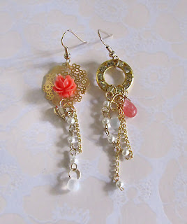 Gladys - assymetrically made of a salmone tone mini rose cabochon on a matte gold floral round filigree. We also have a round crystal ring on the left side with drops of czech fire-polished beads and some pearls below.