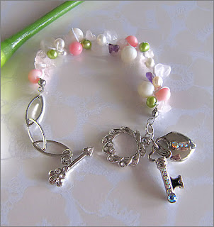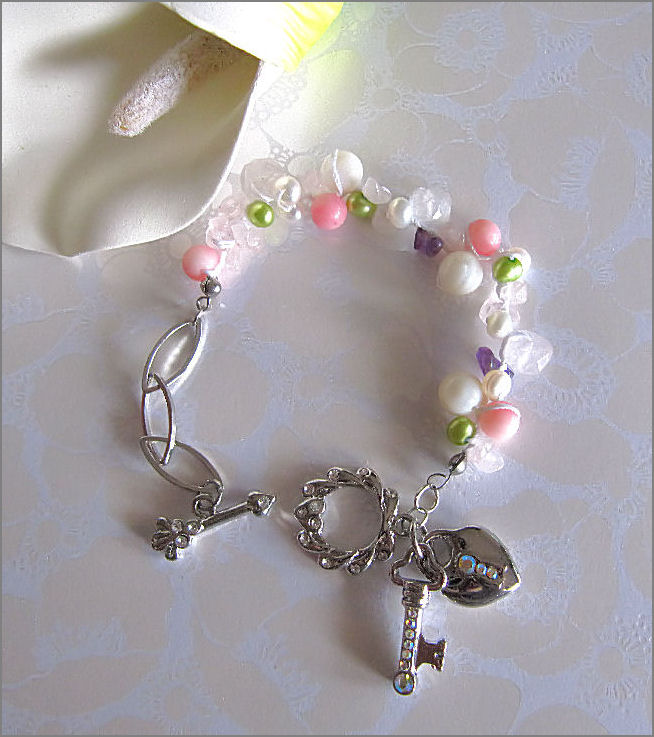 Jemma - a different concept. Several kinds of gemstones is hand woven up as bracelet. We have rose quartz, amethyst, coloured freshwater pearls, polished shell beads, coral, peridot, everything is all here. The bracelet ended up with a set of key and locket charm and toggle clasp.
