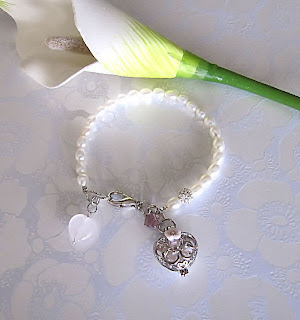 Purity - What a beautiful and lovely bracelet? I love the sweet flower embellished locket heart charm which I have put in some pearls into it. It is made with freshwater pearls with a crystal ball within. Along with it are rose quartz heart and beads.