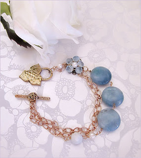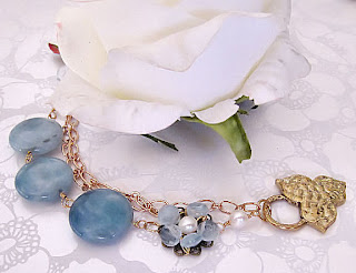 Corinne - I've a sense of peaceful and calmness after completion of the bracelet. This is so light at heart. We have our lovely blue quartz. And if you have noticed, the beautiful flower is actually made from pastel blue Aquamarine briolettes and freshwater pearls. The focal of the bracelet is the unique toggle clasp which is the only one I have now. The chain on it is rose gold plated which give a different tone as the gold ones. With all these combinations, I'm sure you'll love it as much as I do.