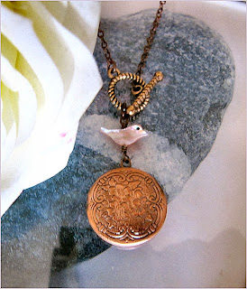 Messenger - Vintage inspired necklace. Beautiful and feminine. The locket pendant has a intricated floral design on the face. On top of the pendant, we have a carved shell bird charm flying above it to drop you a message from your loved ones.