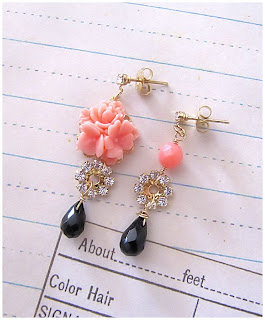 Anthia - Summer blooms. Made lovingly with triple flower cabochon from overseas with Swarovski floral crystals, faceted coral and black glass droplets. Great to keep a pair in your jewelry box.