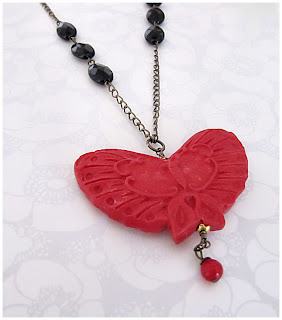 Butterfly Maiden - Beautiful and seductive necklace. The pendant is carved butterfly in red cinnabar with measurements of 38mm x 55mm. On the necklace, we have faceted Onyx oval beads.