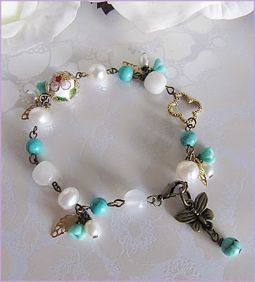 Keily - Sometimes you just want it to be easy and simple. This is the one that you will never regret having it. Made from different kinds of stones. We have howlite turquoise, milkish white jade stones, beautiful smooth freshwater pearls and some leaves here and there, tailing with a butterfly charm. Oh yes, there's a lovely white gold trimmings enamel floral bead too. She's a beauty. Pair it up with your tank and denim just for that easy weekend.