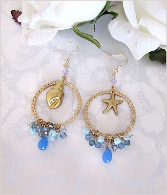 Ocean Gems - Made from imported brass charms with 14k gold plated round hoops with some glass beads, czech beads, Swarovski crystals and a pair of blue glass droplets.