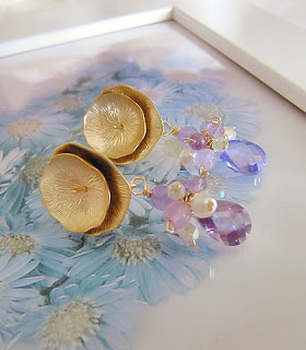 The earrings feature a cluster of Amethyst rondells, coloured jade, fire-polished beads and a pair of Amethyst cubic zircon droplets which reflect differently in different lightings. The 16k gold plated lotus design earstuds have a matte finishing with 925 sterling silver earposts. All wireworks are 14k gold-filled.