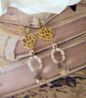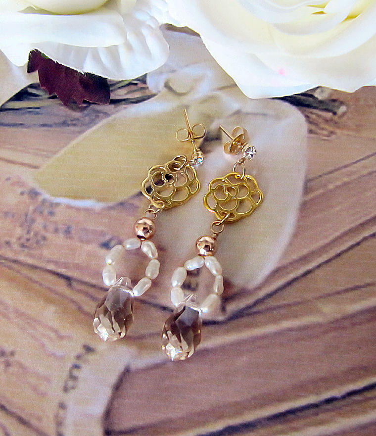 These earrings are so beautiful. Made with freshwater rice pearls with faceted glass droplets suspended from the rose connectors.