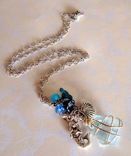 Ocean blue candy-like stone is wire-wrapped with non tarnish silver artistic wires. At the side, we have a silver patina mermaid and shell charms, with toppings of some beautiful flowers.