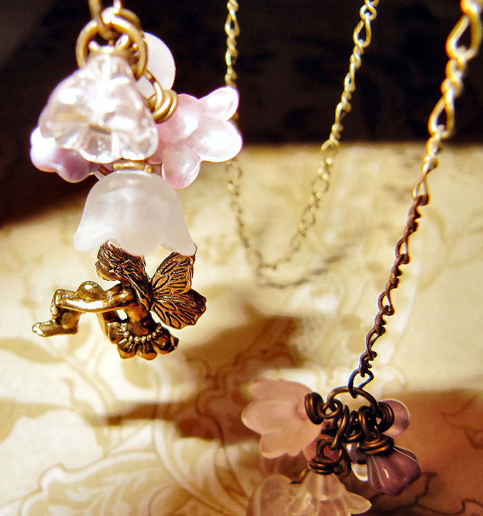 The necklace is made from a cluster of colourful flowers and beads and a lead-free gold pewter fairy charm.