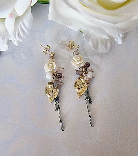 These earrings are so beautiful. The ivory carved roses have bring out the charm of these earrings. Below the roses, we have some beads topping up the brass patina leaves.