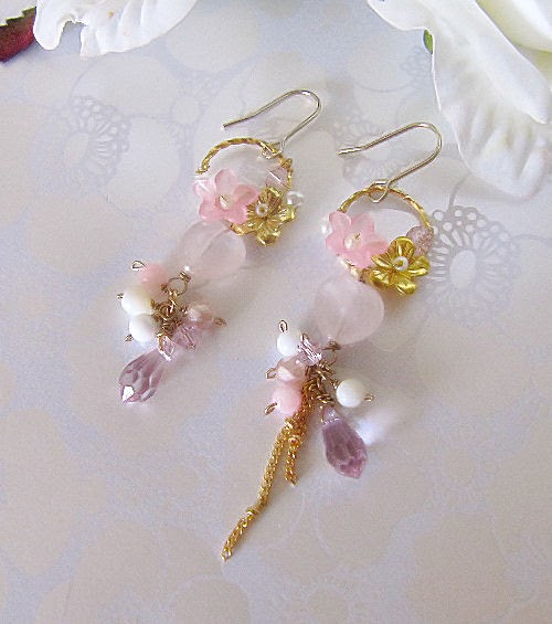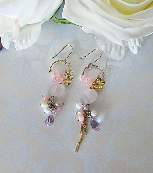These earrings are beautiful. I have wired the flowers on the round hoops. Just right at below are heart-shaped rose quartz beads and bunch of various crystals and beads topping up the Swarovski lilac crystal droplets.
