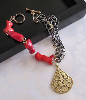 Charlotte - A captivating piece in name. Made with red coral tube beads with strands of black rhodium and gold chains. Along the bracelet is a vintage brass filigree ending with a toggle clasp. I would find this bracelet oriental and seducing. Hope you like it.