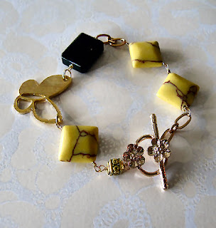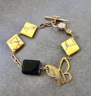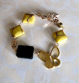 Sunny Fun Day - It was a bright sunny day when shooting was done. The butterfly and the yellow turquoise square have given me the name. To enhance the colours, I have added in a well polished black agate to show the contrast of the bracelet. The chain and floral toggle are in rose gold accents.