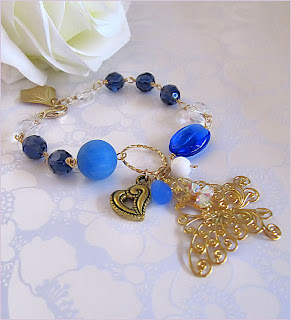 Agace - Royal blue. I love the bright colours from this piece. We have a striking blue oval, a lucite bead round from US and some faceted czech crystals. And of course, the butterfly would be the focus from the bracelet. Hard to resist piece.