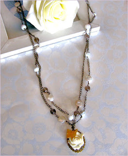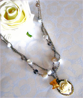 Slyvaine - Oh dear, this is gorgeous. I guess this would be one of my designs which is most easy to wear. It would simply go along with most outfits. The cream rose pendant just came in from overseas. I was so anxious to make something out from it. And you could see here, a brass butterfly fluttering besides the rose. Aren't they lovely? On the necklace we also have freshwater coin pearls, lustrous faceted smokey quartz beads and faceted howlite beads. Bring her back. For sure, you'll love here as much as I do.