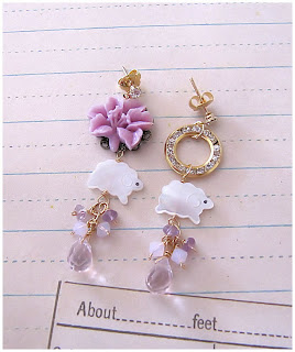 Linette - What a lovely pair? Specially love the pair of shell carved sheep charms. They have a lovely smooth finished. Also we have a lilac flower cabochon and crystallized round hoop, with cluster of Swarovski crystals , Amethyst rondell and a pair of faceted pink droplets dangling right below.
